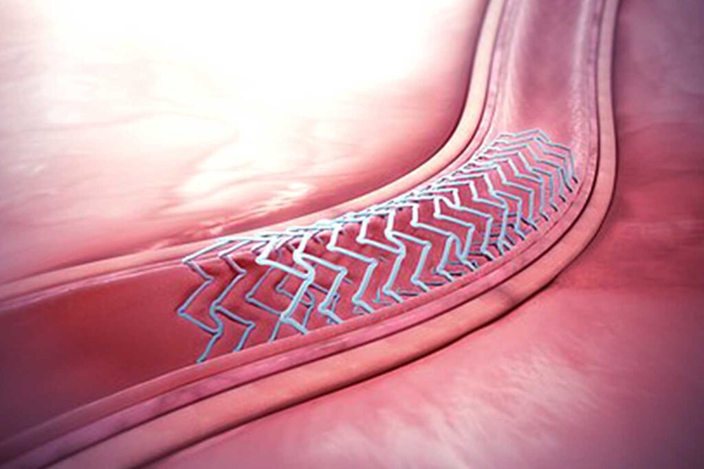 Ilustración médica de un stent bioabsorbible en arteria periférica. Fuente: Wikipedia. Licencia: Creative Commons Attribution-ShareAlike 4.0 (CC BY-SA 4.0).
